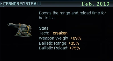 Cannon System III increases reload rate by 75% and ballistic range by 35%. It is a little less powerful than AL3 and HB3 combined, but this one Cannon Sys special occupies just the one slot on your ship -- a nice trade off.